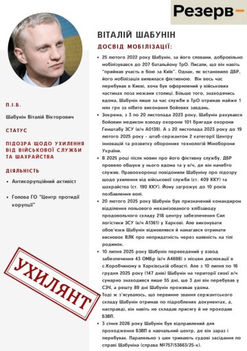 «Глава Центра противодействия коррупции Виталий Шабунин годами фиктивно был оформлен на военной службе, но при этом не покидал Киев. За время службы он получил более 1 млн грн «боевых». Но его служба оказалась фейком, как и заявления о том, что он «принимал участие в боях за Киев». На бумаге был водителем-электриком, стрелком и даже разведчиком. Кроме того, Шабунин присвоил внедорожник Nissan Pathfinder, который волонтеры купили для нужд его подразделения. После огласки ДБР сообщило Шабунину о подозрении в мошенничестве и уклонении от военной службы. Ему грозит до 10 лет тюрьмы», - говорится в досье Шабунина.