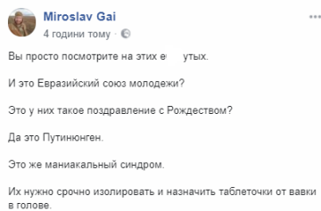 "Вы просто посмотрите на этих е***х. И это Евразийский союз молодежи? Это у них такое поздравление с Рождеством? Так это Путинюнген. Это же маниакальный синдром. Их нужно срочно изолировать и назначить таблетки от вавки в голове", - говорится в комментарии.