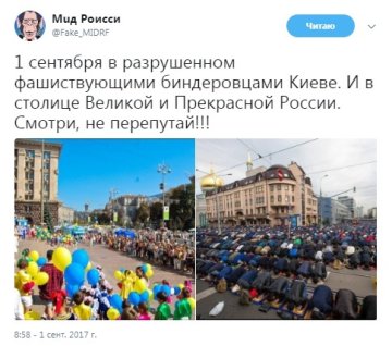 "1 вересня в зруйнованому фашиствующими біндеровцями Києві. І в столиці великої і прекрасної Росії. Дивись, не перепутай !!!" – підписав фото користувач.