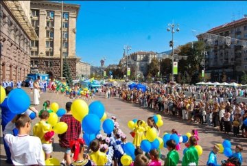 ПідписатисяВідповідні світлини опублікував в Twitter користувач "Мід Роіссі". На одній з них сфотографована столиця Україна у День знань: діти з яскравими синьо-жовтими кульками та у вишиванках стоять на урочистій лінійці.