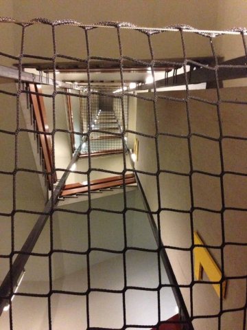 А це сітки на сходових прольотах, щоб ловити падаючих самогубців. Чому? А тому, що на фабриках з виробництва дорогих смартфонів у країнах третього світу настільки важкий багатогодинний робочий день, що їхні працівники готові покінчити життя самогубством. Тому на вікнах там стоять решітки, а на сходах вішають ось такі сітки.