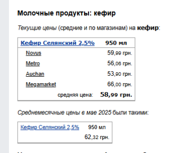 Середня вартість кефіру "Селянський 2,5%" знизилася одразу на кілька гривень – з 62,32 до 58,99 гривні за 950 мл. В окремих торгових мережах продукт можна знайти навіть по 54 гривні.