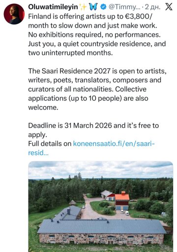 Уявіть собі: вас відправляють у тиху фінську глушину, дають затишний заміський будинок, окремий простір для роботи і ще й щомісячну оплату до €3800 — і все це за те, що ви просто творите.