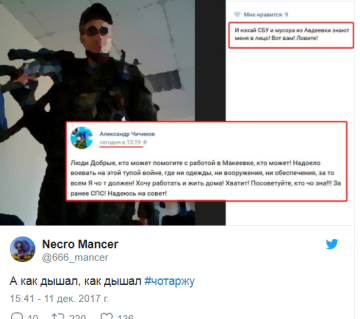 Його фото опублікував у Twitter блогер під ніком Necro Mancer. Відомо, що терорист звертався до СБУ із безпідставними звинуваченнями, а потім просив допомогти знайти роботу – мовляв, "набридла тупа війна".